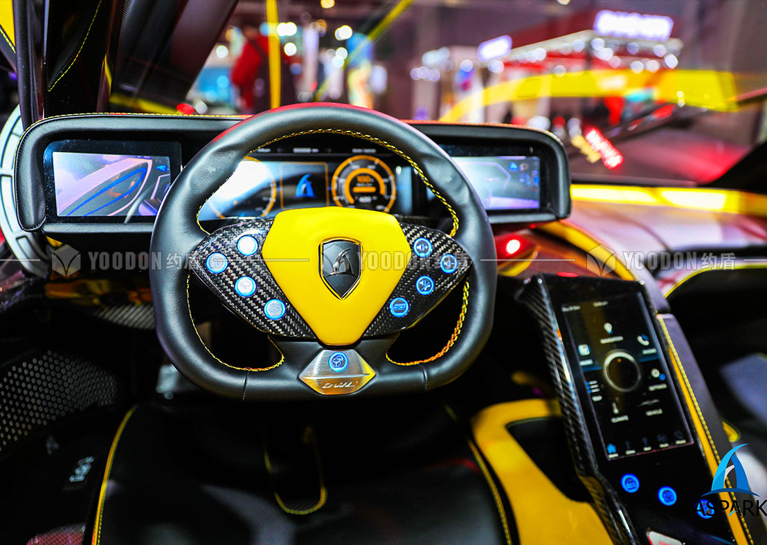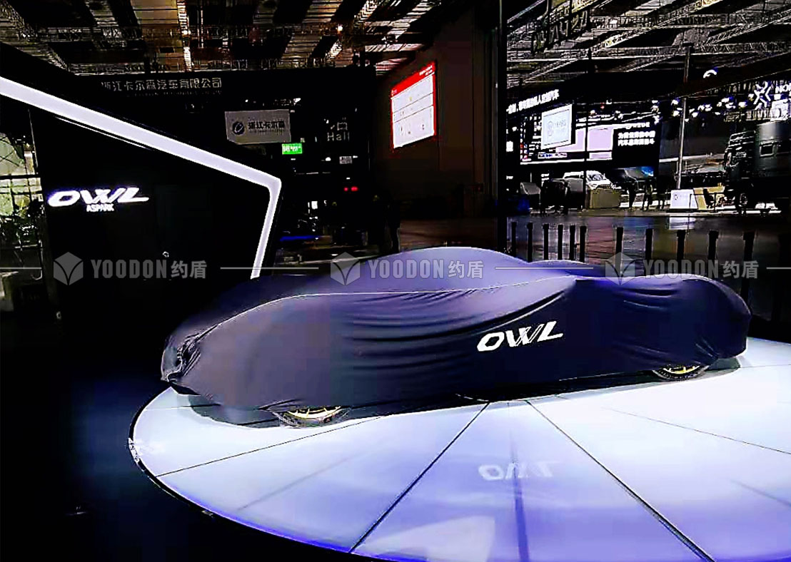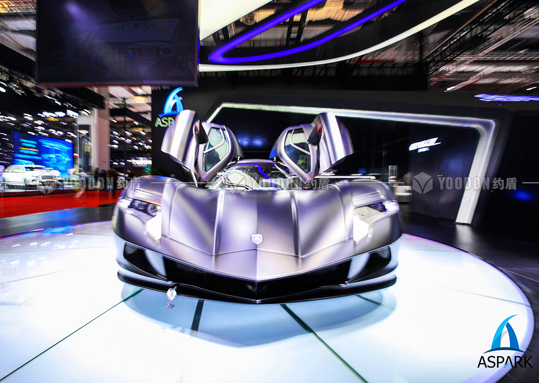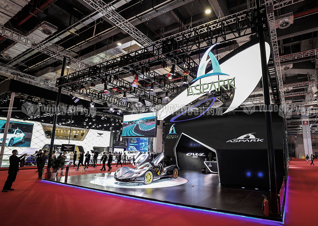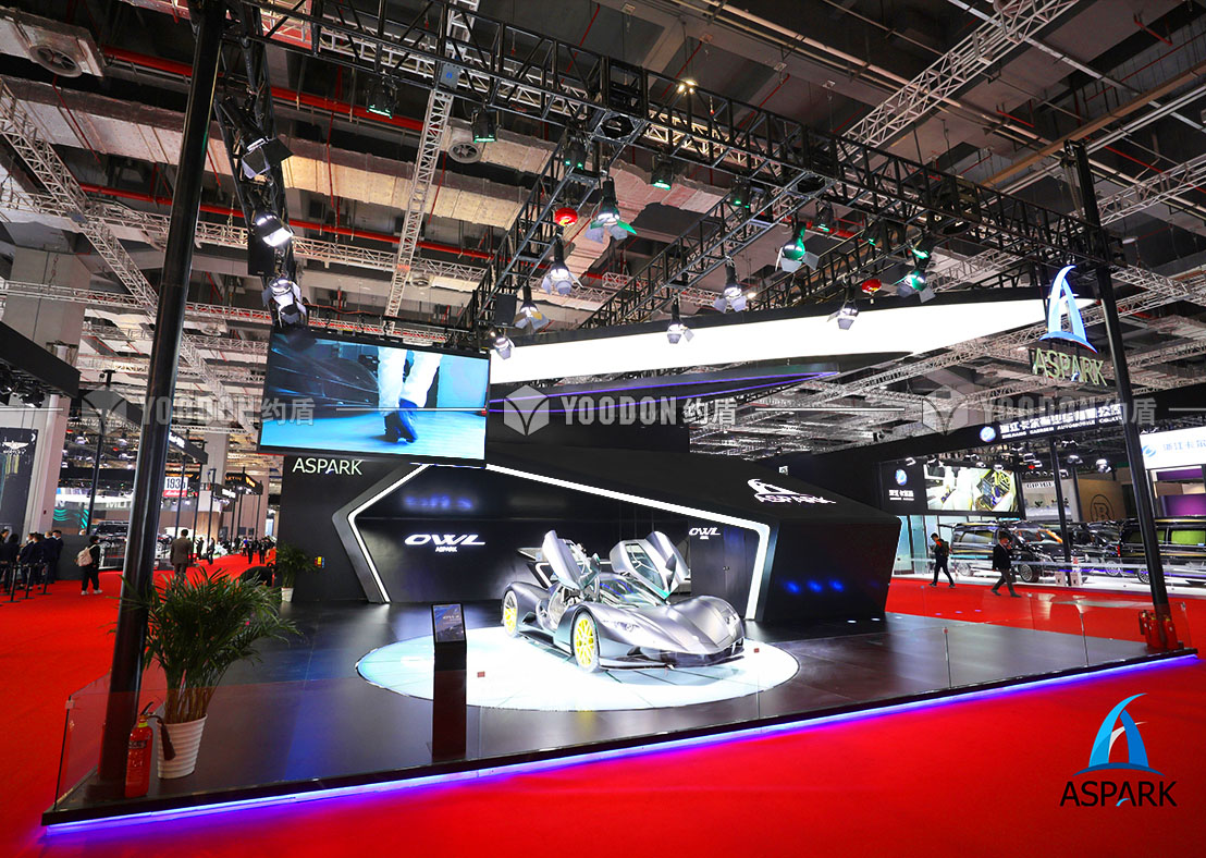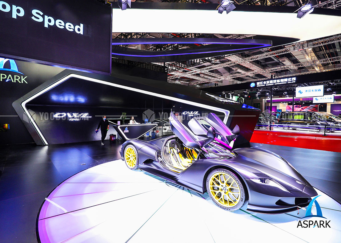 展臺設計思路皆尊崇速度感與獨特感,整體造型設計跳出常規(guī)邏輯,使人耳目一新,傾斜的異形吊頂仿佛是受到跑車高速行進的風速影響,在靜止的空間內帶來極致的動態(tài)感受,與展品的特性、造型等達到各方面的契合。